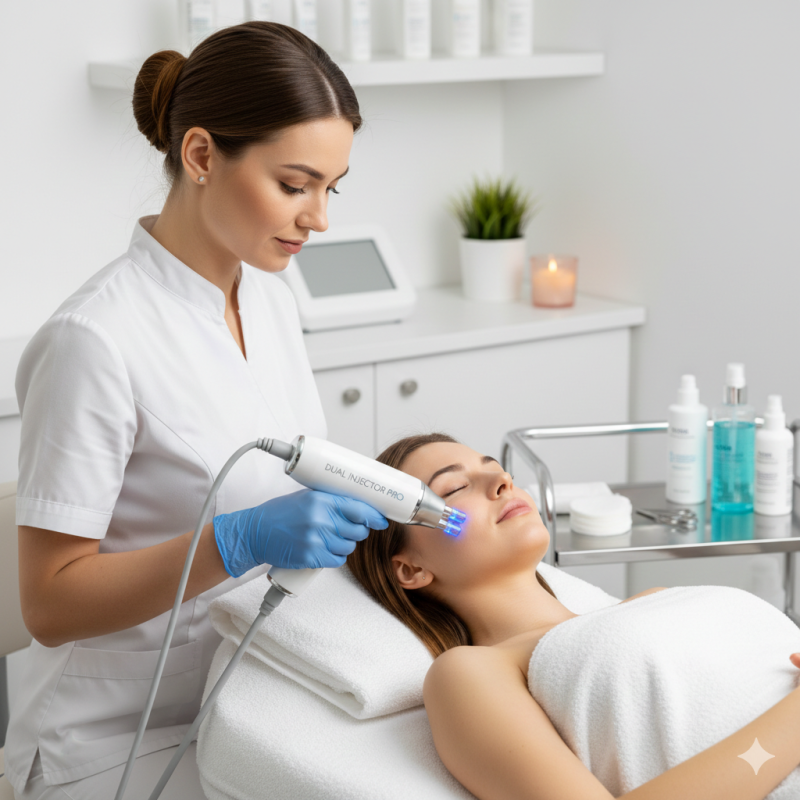 Dual Injector Pro+ yhdistää edistyneimmän RF-teknologian ihokudoksen kohottamiseen ja kiristämiseen sekä tehoaineiden kudostenväliseen imeyttämiseen neulattomalla mesoterapiamenetelmällä. Dual Injector Pro+ antaa kauneushoitoloille edistyneimmän neulattoman ja veitsettömän kasvojen kohotuksen.
